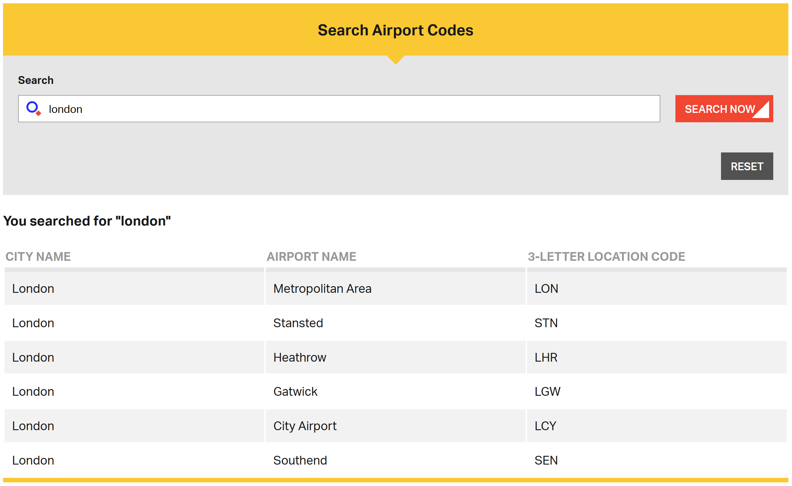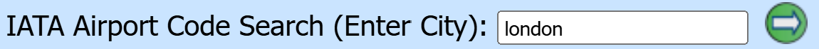 When linking to Kayak to perform searches, you will need to enter 3 character city or airport codes. If you don't know the codes, you can perform an IATA search by entering the city name in the 'IATA Airport Code Search (Enter City)' field. In our example, we have entered 'london' and selected the