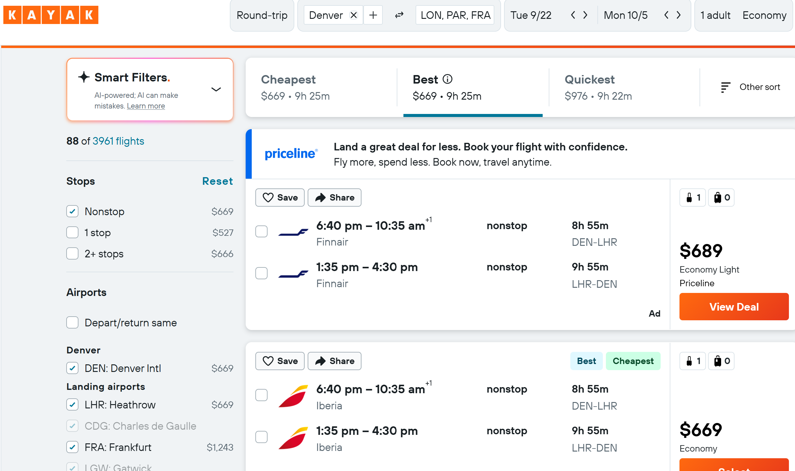 Selecting the Kayak link will search for flights from Denver to London, Paris and Frankfurt for our entered dates.